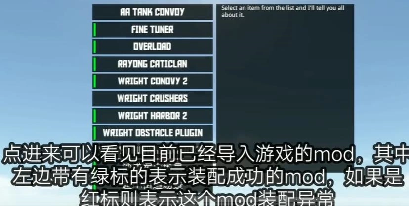 点进来就能看到目前已导入游戏的MOD。左边带绿标的是装配成功的MOD,要是红标就说明这个MOD装配有异常。