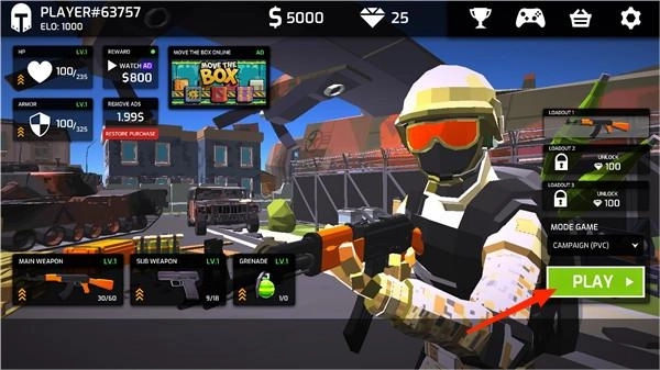 1、游戏左下角设有可选择的武器栏,包含狙击枪、手枪和手雷,点击“play”按钮即可进入游戏