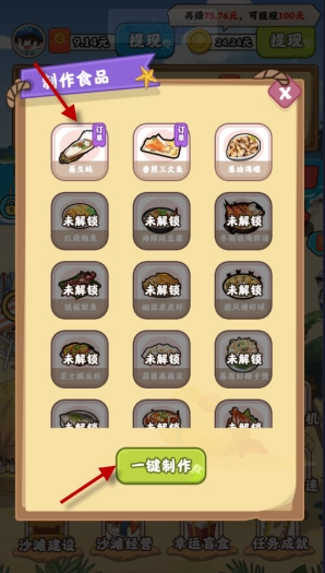点击“制作”按钮后会进入餐品界面,点击对应的美食就能进行制作,也可以选择“一键制作”功能,系统会自动挑选合适的餐品完成制作。