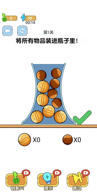 1、创意关卡 超六十个精心打造的关卡,每一关的瓶型与物品搭配都不重样,让你始终保持新鲜感,脑力也能持续得到挑战。