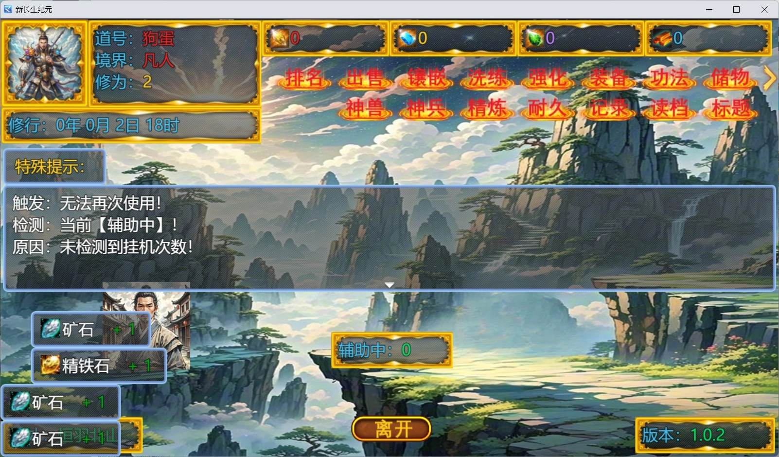 3、如图所示,辅助功能已开启,点击【挖取:矿石】即可自动进行挖矿操作,该过程会持续到【辅助次数为:0】时自动终止,建议不要设置过多的辅助次数……