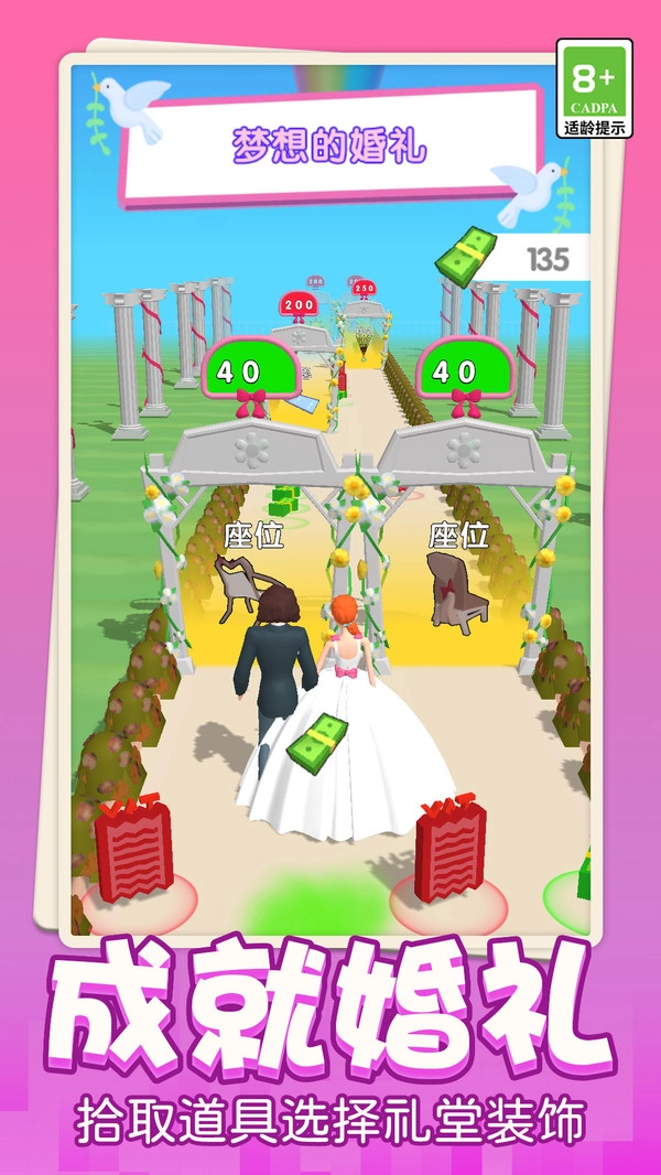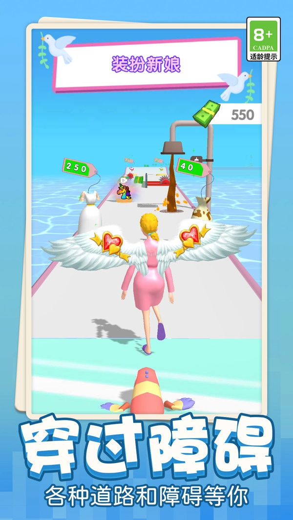 2、在游戏里,玩家将化身为新娘公主,在奔跑的过程中收集各式各样漂亮的服饰,还能随时更换婚纱等美丽装扮。