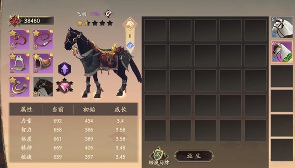 2、对马匹进行改良,能够提升坐骑的力量、智力、体质、精神、敏捷这五个属性。