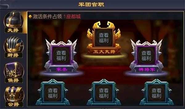 军团官职系统需满足至少占领1座都城的开启条件,该系统共设置15个职位,每个职位均配备官职奖励与收益加成等福利。随着占领都城数量的增加(达到1/3/6/10座时),将解锁更高等级的爵位,官职奖励也会相应提升。(其中,第1个官职固定由军团长担任,其余官职则可由团长、副团长自主进行分配)