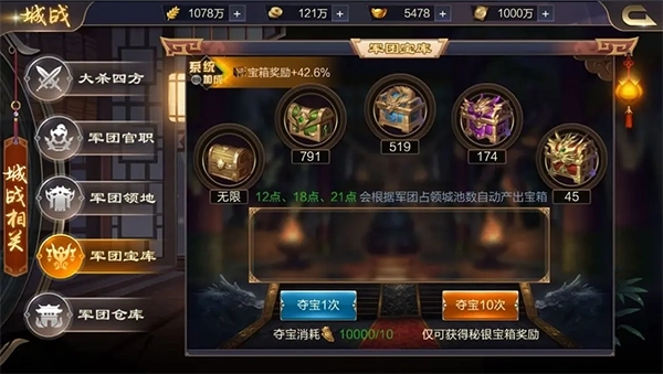 军团内设有宝库,每天12点、18点和21点这三个时间点,系统会依据军团占领的城池数量产出相应宝箱。军团成员可以消耗“令箭”来参与宝箱抽取,从而获取丰厚的资源奖励。