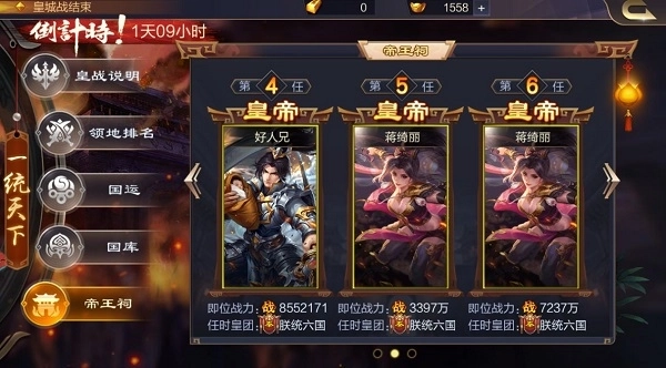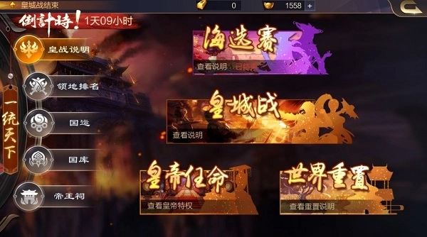 ⑷皇城战落幕标志着天下一统,系统会发放领地排名奖励;次日全图将进行重置,下一期一统天下随即开启,届时各军团需重新在世界地图上争夺板块与城池。