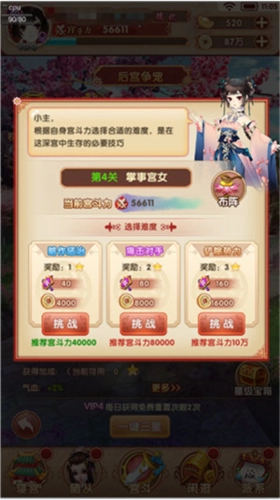 进入争宠玩法后,主界面会呈现多个功能按钮。其中装备商店、奖励预览和星级宝箱都和该玩法的奖励体系有关,具体内容后续再做详细说明。该玩法以3关为一个大章节,点击界面上的人物形象就能进入战斗选择场景。这里建议玩家根据自身战力情况选择合适的挑战难度,因为不同难度下获得的权势值、金币数量以及星级评定都会有所差异。