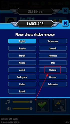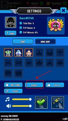首次进入银河之战后,先快速完成游戏教程,接着返回主界面,点击左上方的【头像】,再点击箭头所指的【English】选项。