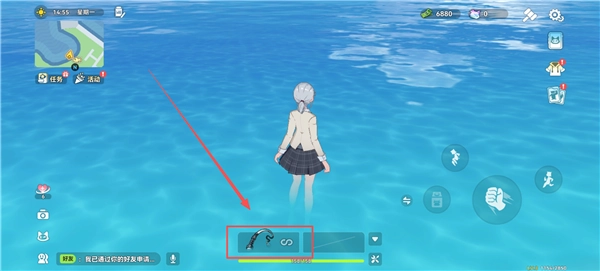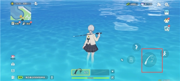 6、等到鱼咬钩,点击收杆将其钓上来。