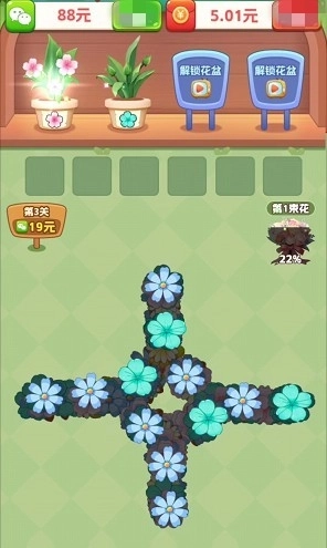 3、每个关卡都会呈现不同种类的花朵,等待玩家触摸并消除它们。只有相同的花朵才能在对应的花盆中被消除并绽放出绚丽的光彩。