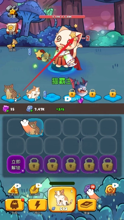 游戏采用放置挂机玩法,猫咪们会自动战斗,你不用时刻操作,只需定期领取掉落的奖励。