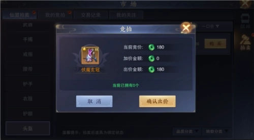 仙盟拍卖的物品上架初期设有预览阶段,各位上仙可提前查看是否有自己需要的物品。待预览倒计时结束后,竞价正式开启:首次出价默认等同于起拍价,第二次出价时系统会自动给出一个默认加价幅度;若竞价过程中价格超过物品的一口价,则直接以一口价完成购买;对于没有设置一口价的物品,将在竞拍倒计时结束时,由出价最高者获得。此外,参与竞拍但最终未成功拍得物品的仙友,其竞拍时消耗的货币将全额返还。