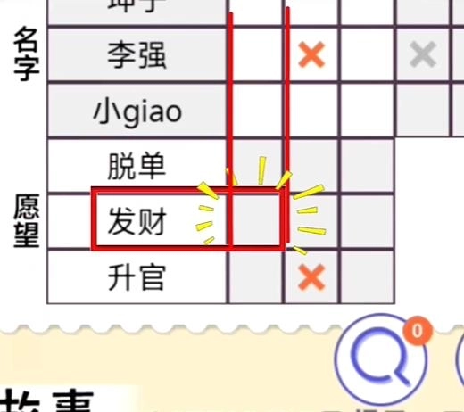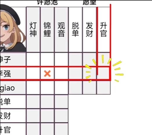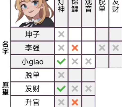 那就先找到李强,然后在他与锦鲤相交的表格里打上叉。