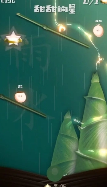 在这一关中,要想顺利下落吃到星星,就得从最上方那根竹竿的左侧经过,因此第一步得先爬上右边最高的笋尖位置。