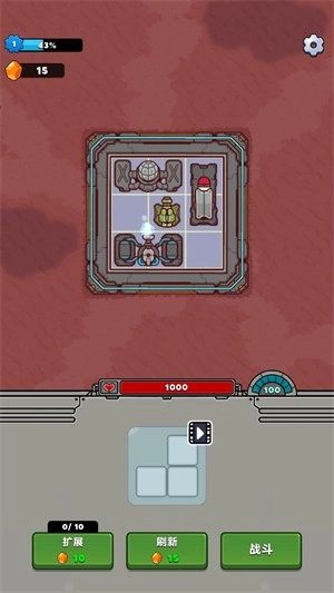 6、一波战斗结束后玩家会进入休整状态,你可以点击刷新按钮获取新的炮塔,也可以点击扩展按钮来扩大基地范围。