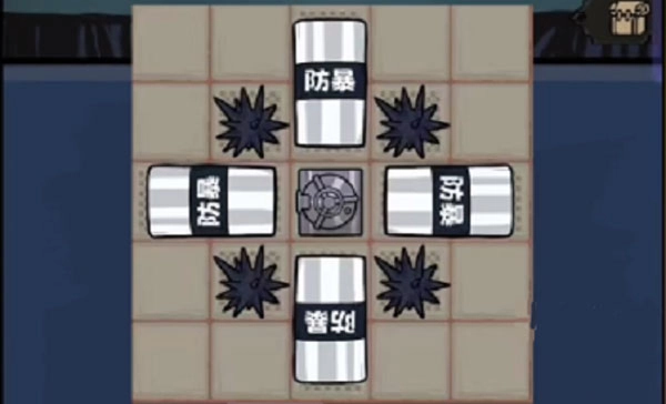 需要准备四个盾牌、四个海胆球和一个保险库大门,务必牢记它们的位置与朝向都不能有丝毫差错,必须严格依照上图的样子进行摆放。