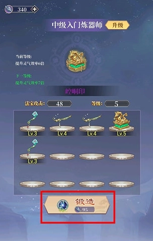 3、我们还可以点击炼器功能,进入后选择锻造选项。完成锻造操作后,就能获得一件一级法器。再次点击锻造,又能得到另一件法器。把这两件法器进行合成,就能得到新的法器,同时我们的炼器师等级也会从初级入门提升到中级入门。只要持续合并法器,就能不断增强法器的攻击力。