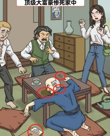 1、首次点击开场画面中那位已故富豪的脖颈、他吐出的残渣、右手写下的字迹以及地面上的文件袋。