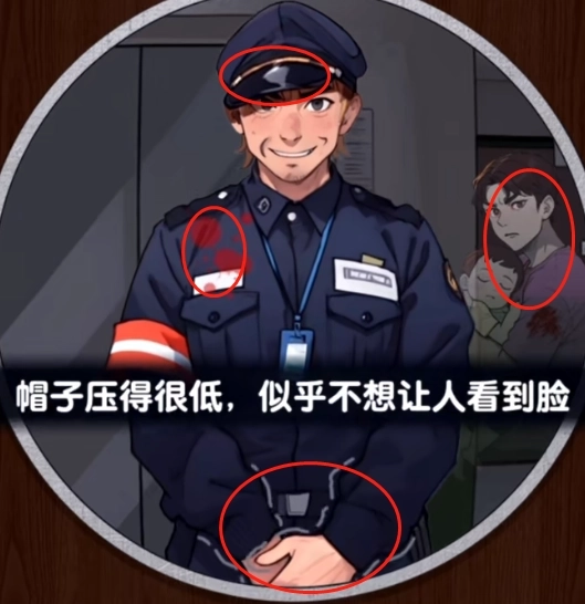 4、这个警察的帽檐压得很低,衣服上有血迹。