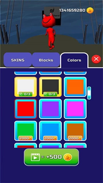 3、上方第一栏是角色模型,第二栏是砖块样式,第三栏则是角色皮肤颜色,大家按照自己的喜好解锁就行(解锁方法是点击直接解锁,最下方的按钮是看广告得金币的按钮,有些物品可以用金币点击购买,还有些物品需要多次观看广告或者付费购买)