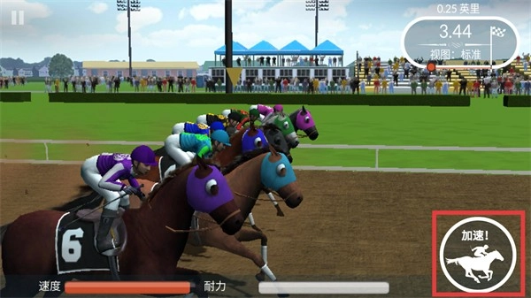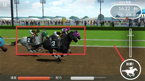 比赛时可点击右侧的【加速!】按钮来提高马匹速度,与此同时要留意【速度-耐力】条,通过平衡这两项属性来保持冲刺状态。