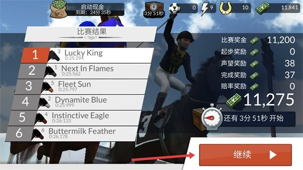 4、取得【第1名】的成绩后,可查看【比赛奖金-11275】,接着点击【继续】按钮进入下一场赛事,争取再创佳绩。