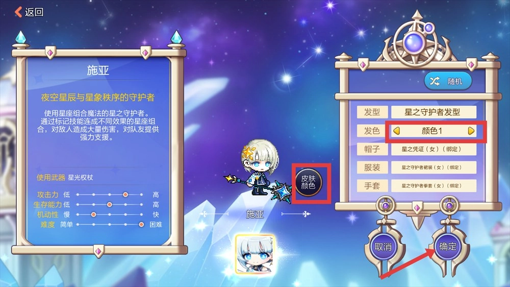 1、创建角色时,能够调整发型的【颜色】,也可以自定义【皮肤颜色】,点击【确定】按钮即可完成角色的定制。
