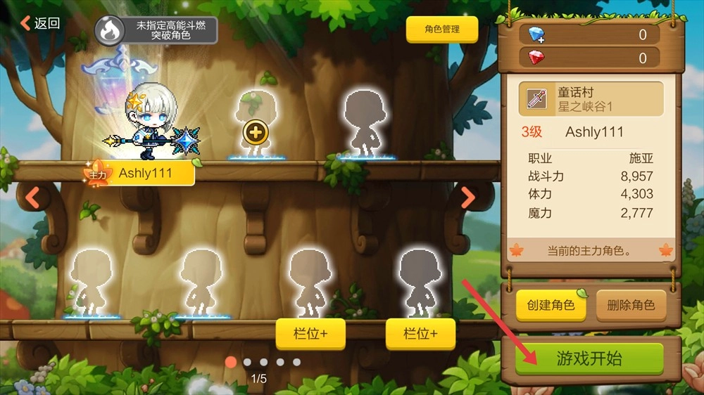 2、在确认好主力角色的战斗力、体力等相关信息后,点击【游戏开始】按钮,即可进入【童话村-星之峡谷1】,正式开启你的冒险之旅。