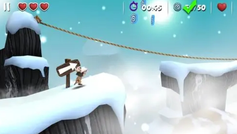 继续往前走,到印第安探险第30关的第三个岔路口时,选上面那条路,这时候得用二段跳跳到最高处再滑翔,不然会直接掉下去。