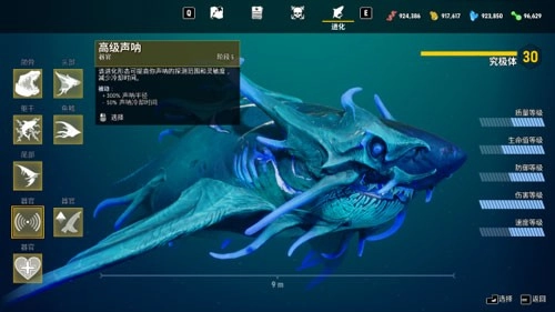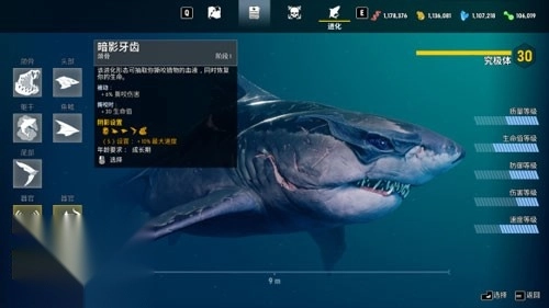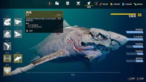 统计驱动的角色定制系统,通过定向进化鲨鱼的身体部位,增强器官功能,并触发捕食狂怒状态。