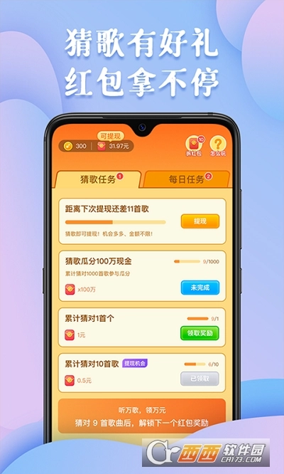 最强猜歌王红包版是一款趣味性十足的红包赚钱游戏,游戏的玩法十分简单,玩家只需要根据一小段的歌曲旋律猜出对应的歌名就可以成功过关了,游戏曲库十分丰富,完成关卡挑战即可获得红包奖励,喜欢的朋友可以来西西最强猜歌王红包版进行体验