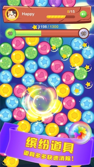 4、看着五颜六色的泡泡一排排一列列地消除,你会收获到一种别具一格的快乐。