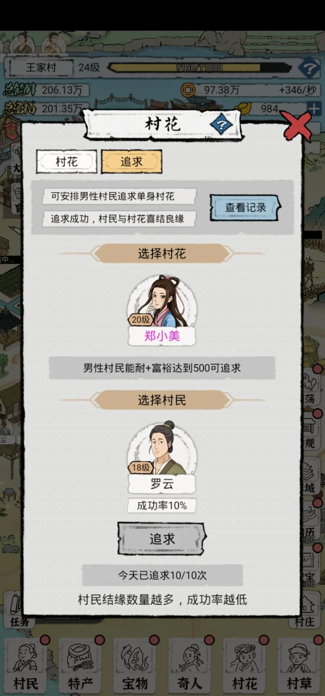 四、村花选择方面,我们只追求紫色品质及以上的村花。这类村花能带来不低的加成效果,不过选择它们需要满足一定的条件。