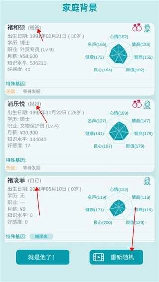 进入游戏后,系统会为你生成独一无二的家庭背景与初始属性,包括父母的职业、性格、经济状况,以及你自身的智力、体质、魅力等基础特质。若对初始设定不满意,可随时点击重置,直到遇见最契合心意的人生起点。