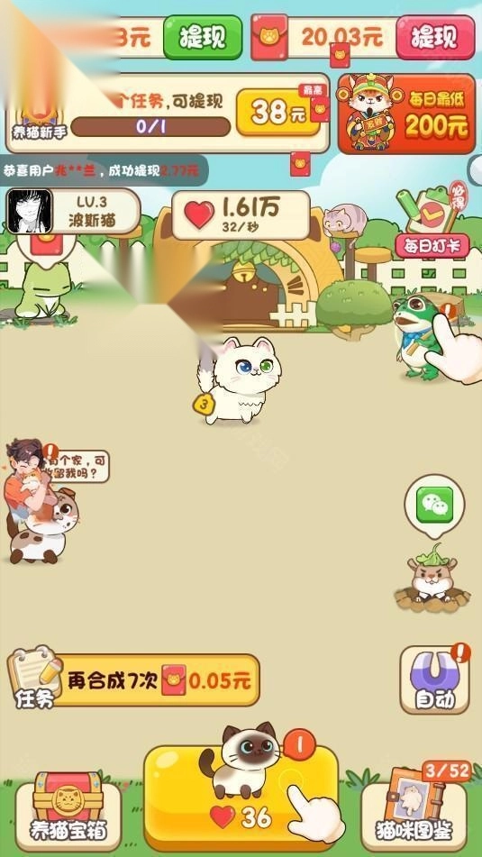 随着游戏进程的推进,会有更多玩法内容和全新关卡挑战逐步解锁。2、玩家等级越高,能获得的红包奖励就越丰厚,还能解锁更多猫咪图鉴。