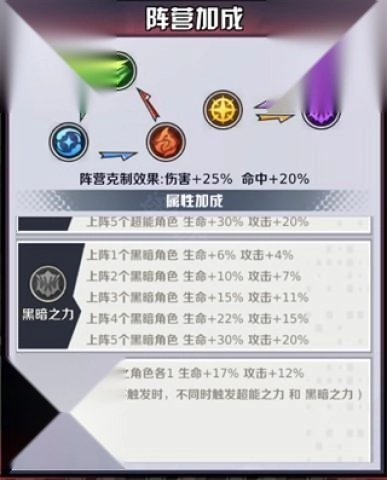 游戏中的阵营分为五个类型:神速(绿)、掌控(蓝)、崩坏(红)、超能(光)和暗。