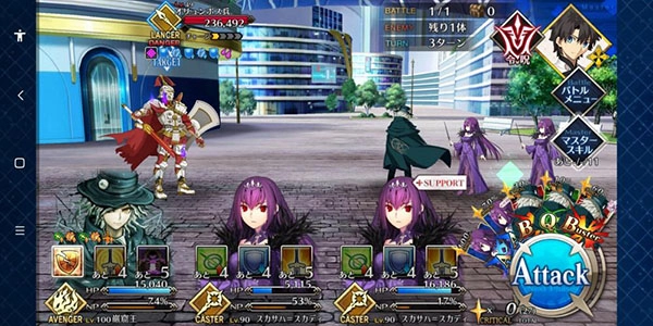 2、战斗时,我方出战的3人(包含协力玩家)每次攻击仅能选取三个指令,玩家需在角色选择以及Quick、Arts、Buster卡片的组合运用上做出抉择,不同颜色卡片的排序与搭配会带来各异的效果。另外,当某个英灵的集气槽积满时,便可触发必杀技能。
