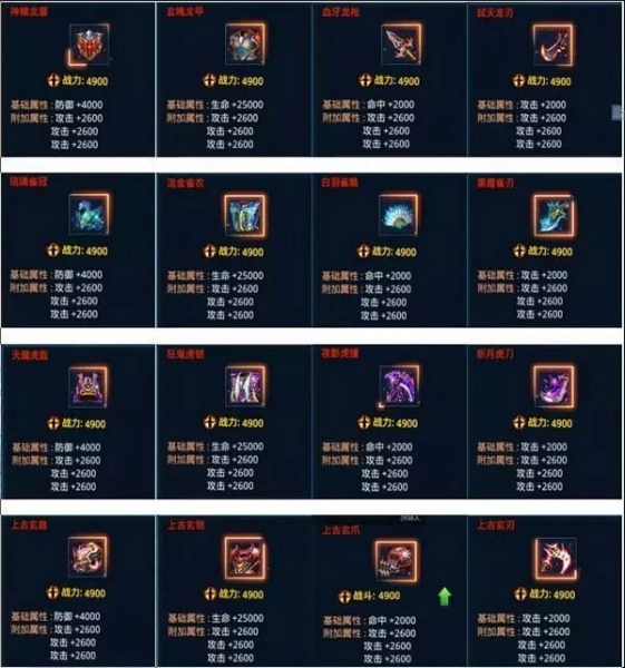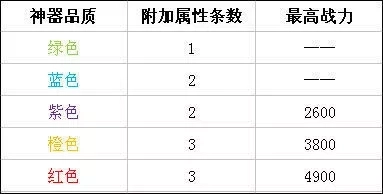 神器的附加属性包含防御、生命、命中、攻击与闪避这五种,且这五种属性是随机生成的。绿色品质的神器仅带有一条附加属性,蓝色和紫色品质的神器拥有两条附加属性,橙色和红色品质的神器则具备三条附加属性。大部分玩家所穿戴的神器主要有紫色、橙色和红色这三种品质,其中紫色神器的最高战力为2600,橙色神器的战力固定为3800,红色神器的战力固定为4900。