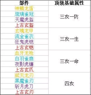 神器的属性包含防御、生命、命中、攻击与闪避这五种,而基础属性仅具备一条,其主要类型涵盖防御、生命、命中、攻击这四种。所有神器的基础属性大多由所在部位来决定,例如处于“左上角”部位的龙盾、鸟冠、虎盔、龟盔,它们的基础属性是防御;位于“右上角”部位的龙甲、鸟衣、虎铠、龟铠,其基础属性为生命;在“左下角”部位的龙矛、鸟扇、虎镰、龟爪,基础属性是命中;处于“右下角”部位的龙刀、鸟刀、虎刀、龟刀,基础属性则是攻击。