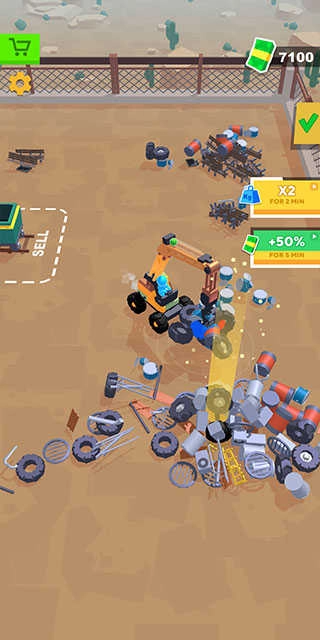 1、借助垃圾处理工具来完成任务,利用磁铁和垃圾清运车清理后方区域的所有垃圾,以此获取收入。