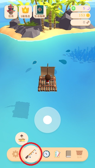 3、推动渔船移动至小鱼附近,点击“鱼竿”按钮,接着长按屏幕,同时调整鱼竿的投放位置。