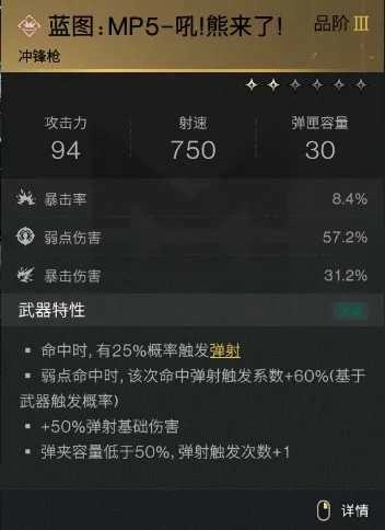 要是说进阶武器的推荐,小七首推的绝对是MP5-吼!熊来了!。它的弹射特性在面对扎堆敌人时效果最显著,只要瞄准血量最厚的那个猛打就行!不过这并不意味着它只能应付群怪,MP5本身具备的高射速和稳定性,能让它精准对准怪物弱点,快速输出大量伤害。