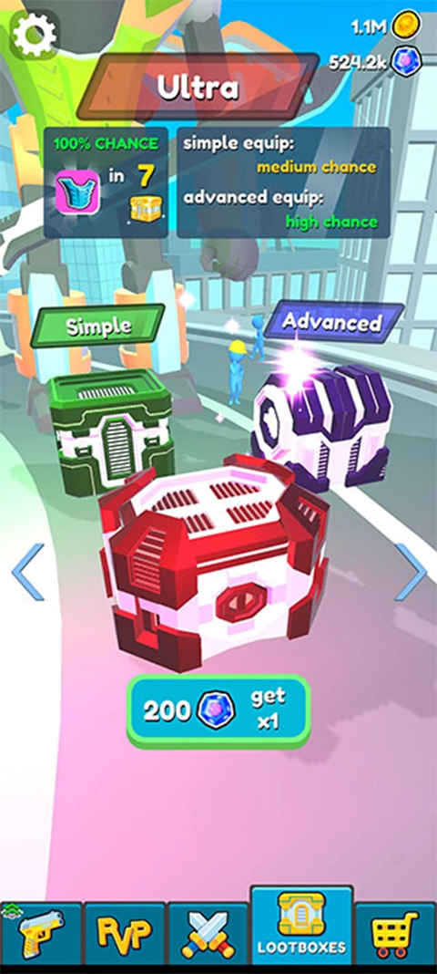 4、点击宝箱图标进入开宝箱页面,玩家可以放心开启宝箱,无需担心金币不足,从而获取大量武器装备来提升自身实力。