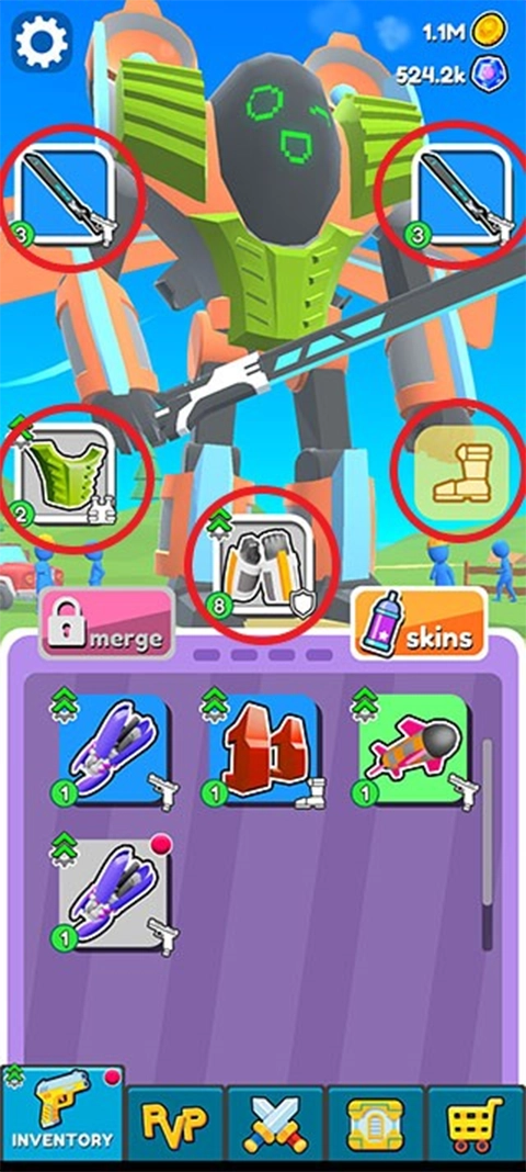 2、点击屏幕左下角的手枪图标,进入装备升级界面,接着点击机器人周边的五个图案,就能进行装备的升级或购买操作。