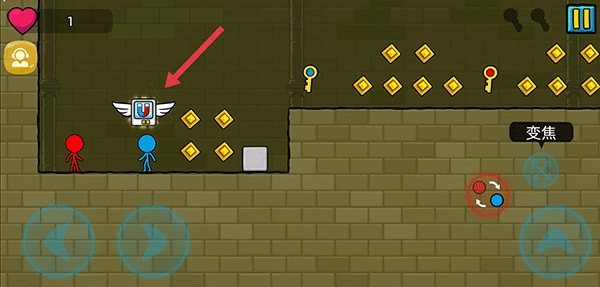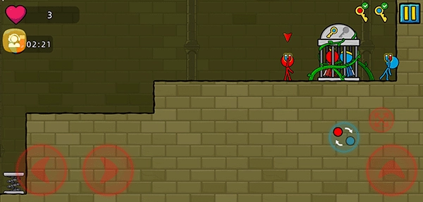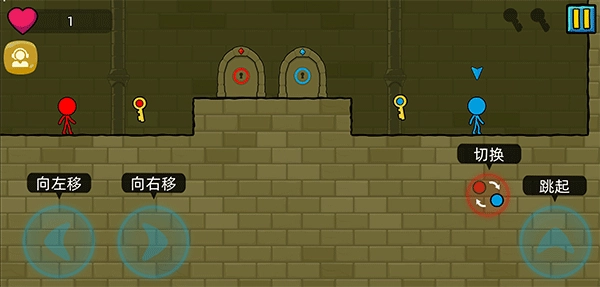 1、进入游戏后,通过向左移动、向右移动的操作来控制冰火人的移动方向,切换按钮用于切换当前操控的角色。