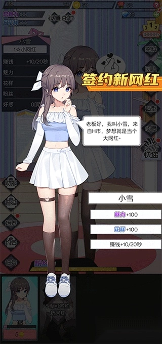 3、玩法十分简单,首先得签约一位新网红,每位网红都具备不同的魅力、花样等属性。