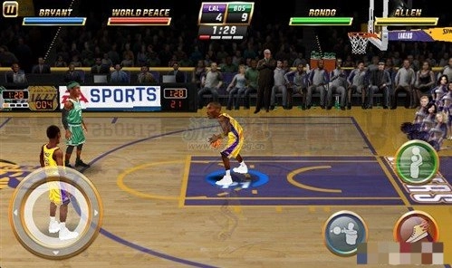 进攻(持球状态):通过按住方向键控制角色移动;轻点投篮键可完成投篮或做出假动作;传球键轻触就能传球,在空中也能操作;按住加速键可提高冲刺速度;双击挥肘键能制造身体对抗;冲向篮筐时按下投篮键会起跳上篮,加速过程中滑动该键则触发灌篮;晃动设备可实现转身运球和胯下运球动作;无球队员跑向篮筐并起跳,若队友位置合适会自动完成空中接力。